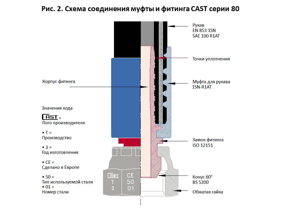 Компания CAST S.p.a. изобрела специфическую «хвостовую часть» РВД - фитинг и муфту, которые при обжиме образуют мощный клинкерный зажим (