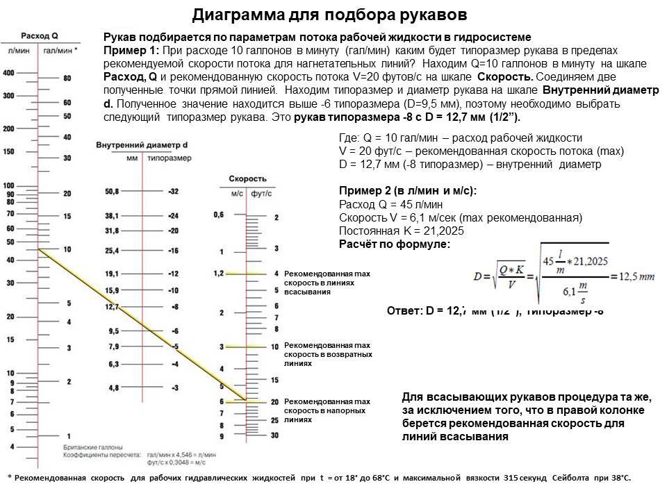 Необходимо проверить соответствие параметров потока рабочей жидкости на соответствующем участке гидравлической магистрали и параметры рукава (стандарт и номинальный диаметр). Для этого потребуется расход (л/мин) и скорость (м/с) потока рабочей жидкости. Расчёт номинального диаметра рукава производится в соответствии с